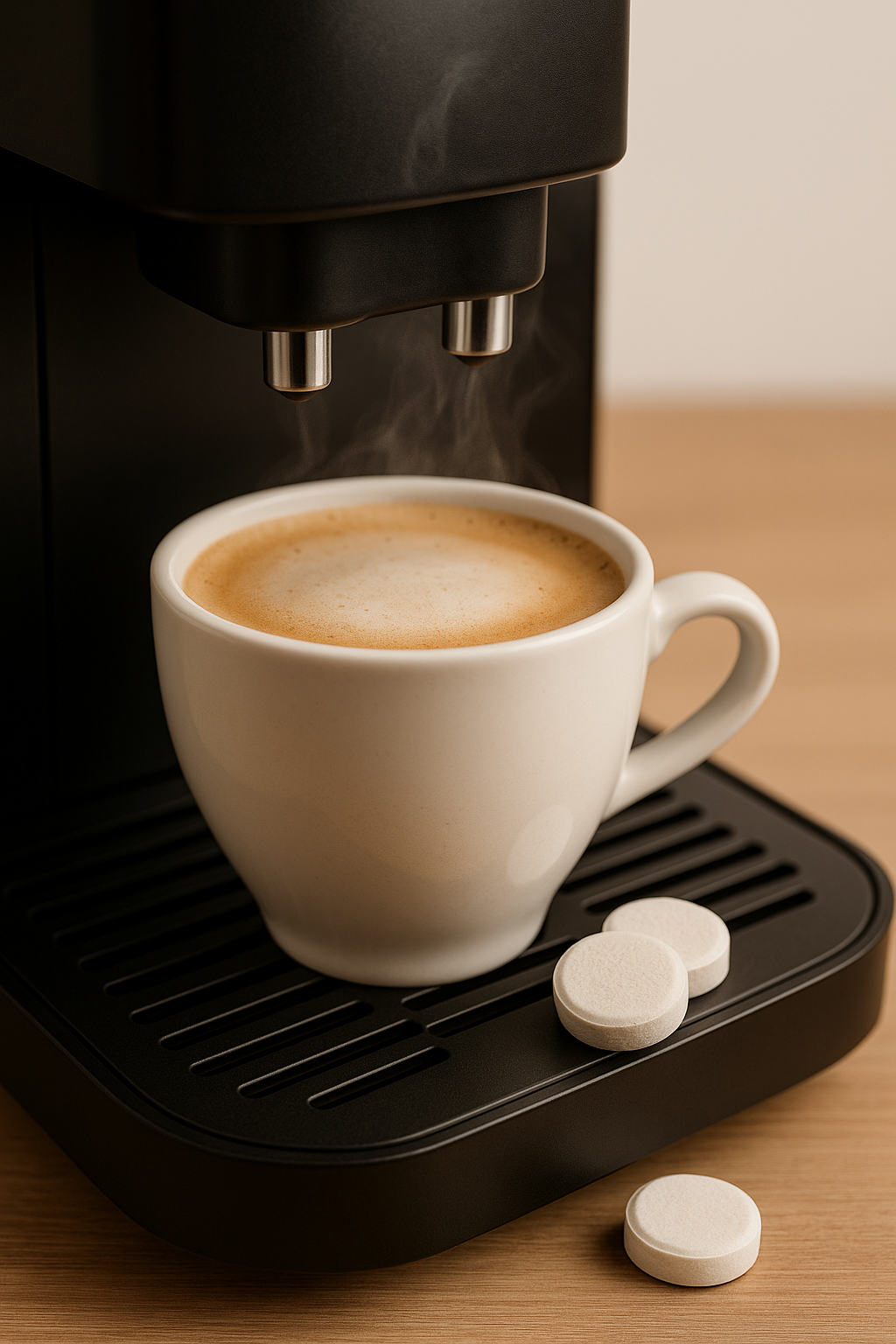 Plaats een tablet in de machine, start het reinigingsprogramma en de resten worden verwijderd.